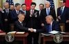 미국과 중국은 15일(이하 현지시간) 백악관에서 1단계 무역 합의 최종 서명식을 가졌다. 서명식에는 트럼프 대통령을 비롯해 양국 고위급 무역협상 대표인 로버트 라이트하이저 미 무역대표부(USTR) 대표와 류허(劉鶴) 중국 부총리가 참석했다. 지난달 13일 양국이 공식 합의를 발표한 이후 약 한 달 만에 서명이 이뤄졌다. 2018년 7월 양국이 25%의 관세를 매기며 무역 전쟁의 포문을 연 지 18개월 만이다.