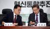 보수통합을 목표로 하는 혁신통합추진위원회 박형준 위원장(오른쪽)과 새로운보수당 정운천 의원이 16일 오전 국회 의원회관에서 열린 혁신통합위원회 3차 회의에서 대화하고 있다. (사진 : 연합뉴스) |