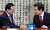 자유한국당 황교안 대표와 더불어민주당 이해찬 대표가 인사하고 있다. 김영민 기자 |