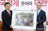한편 김 위원장은 황 대표에게 그림을 선물하며 ‘서민 정당’을 강조했다. 그림에는 시장 상인이 아이들에게 포도를 나눠주는 모습이 담겨있다. 어려운 환경에서도 서민을 위하는 정당이 돼야한다는 뜻을 담았다고 설명했다.