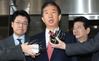 자유한국당 김성태(가운데) 의원이 17일 서울남부지법에서 열린 1심 선고 공판을 마친 뒤에 취재진 질문에 답하고 있다./연합뉴스 |
