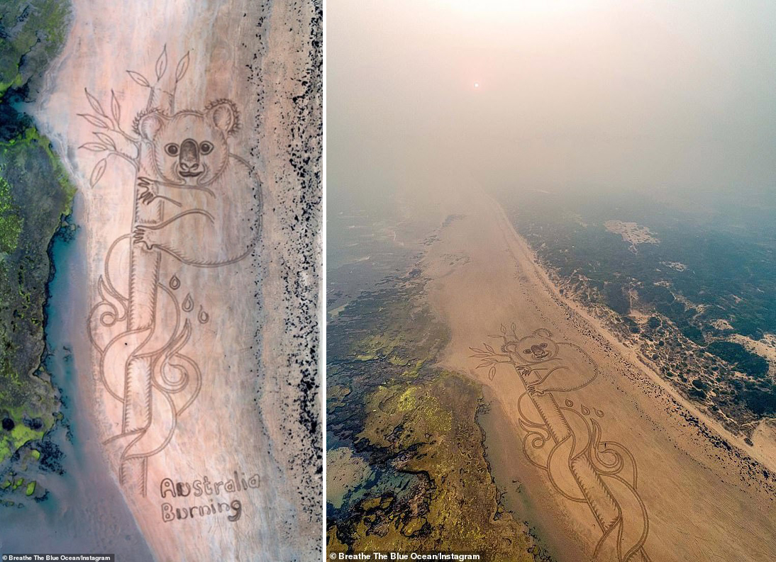 이는 코알라 한 마리가 산불 때문에 불에 타고 있는 나무 한 그루에 매달려 있는 모습으로, 인스타그램에서 ‘브리드 어 블루 오션’(Breathe a Blue Ocean)이라는 이름으로 활동하고 있는 한 익명의 예술가가 그린 것이다.