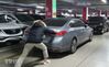 19일 전주 신도시인 에코시티의 한 아파트 주차장에서 입주자가 자신의 승용차를 빼기 위해 가로주차차량을 밀고 있다. |