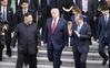 지난해 6월 진행된 남북미 판문점 회동에서 이야기를 나누는 문재인 대통령(오른쪽부터), 트럼프 미국 대통령, 김정은 위원장. |