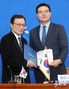 더불어민주당 영입인재 11호 방위사업전문가 최기일 박사가 21일 오전 서울 여의도 국회에서 열린 인재영입 발표회에서 이해찬 대표에게 입당원서를 전달하고 있다./사진=홍봉진 기자 |