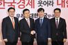 황교안(왼쪽 두 번째) 자유한국당 대표가 7일 국회 당대표실에서 취임 인사차 예방한 하태경 새로운보수당 책임대표와 악수하고 있다.김명국 선임기자 daunso@seoul.co.kr |