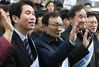 이해찬 더불어민주당 대표(가운데), 이인영 더불어민주당 원내대표(왼쪽)와 이낙연 전 국무총리가 23일 오전 서울 용산역에서 귀성객들에게 설 인사를 하고 있다./연합 |