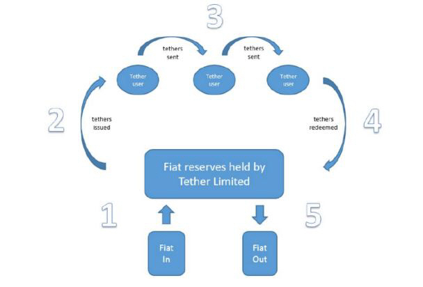 1단계 : 사용자가 법정 화폐를 입금한다.→ 2단계 : 테더사는 사용자의 테더 계정을 생성하고 입금된 법정화폐 가치에 해당하는 테더를 발행한다.→ 3단계 : 사용자는 획득한 테더를 통해 다양한 곳에서 거래를 진행한다.→ 4단계 : 사용자가 상환을 위해 테더사에 테더를 입금한다.→ 5단계 : 사용자의 은행 계좌에 입금된 테더의 가치에 해당하는 법정화폐를 돌려보낸다. 테더의 소각작업이 진행되기도 한다.