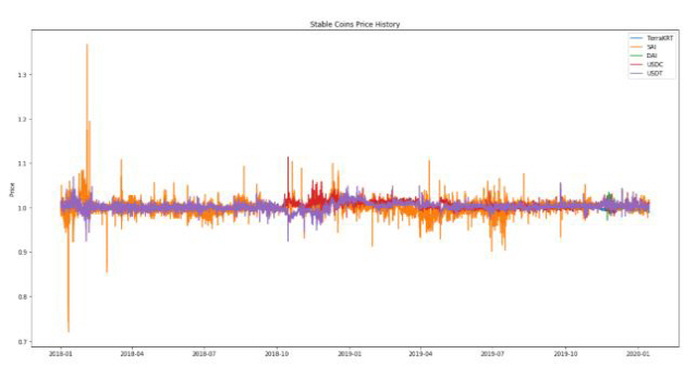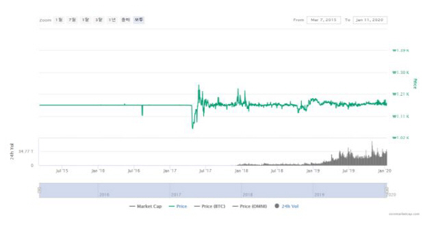 위 그래프는 2015년 5월부터 현재(2020년 1월 17일)까지의 테더 가격을 보여준다. 2017년 4~5월에 큰 가격변동이 눈길을 끈다. 이는 2017년 4월에 있었던 웰스파고(Wells Fargo) 소송 등의 문제가 영향을 미친것으로 추측된다. 테더는 대만 은행을 통해 법정화폐를 송금받고, 웰스파고 은행을 통해 대만 외부로 송금을 진행했다. 하지만 2017년 4월 갑작스럽게 대만 은행들과 웰스파고 은행이 테더 이용을 위한 송금 지원을 중단한다. 따라서 이후 테더가 새로운 거래 은행을 찾기 전까지 이용자들은 테더 발행과 상환 등의 업무를 수행할 수 없게 되었다. 거래 은행의 불안정한 상황으로 인한 가격 하락은 이후에도 종종 있었다. 2018년 말 테더의 거래은행인 노블사의 재정난으로 인해 테더의 가치는 장중 0.91달러까지 떨어지기도 했다.
