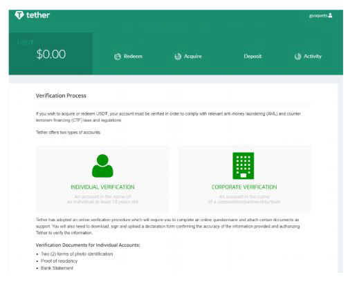 0단계 : 테더 서비스(app.테더.to)에 가입하고, 본인인증 절차를 거친다. 테더는 법정화폐를 다루기 때문에 꽤 강도 높은 본인 계좌인증 절차를 거친다.