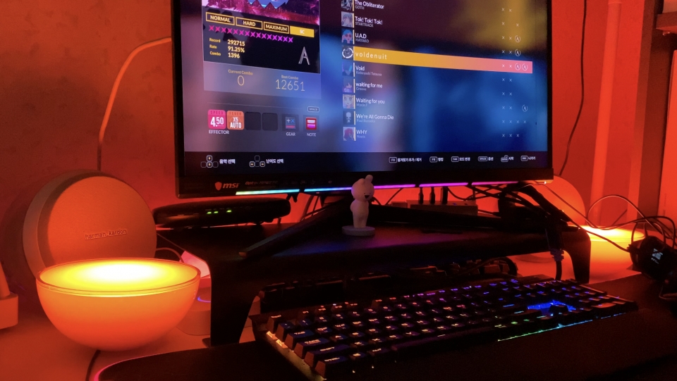 리듬 게임의 재미를 더해 줄 RGB 기능도 꽤 탄탄한 편이다. 특히, 방의 조명을 켠 상태로도 꽤 밝은 광량을 보였다. 광량 설정 키를 통해 이를 직관적으로 조절할 수 있다. 2가지 키를 조합해 광량을 설정할 수 있었던 타사의 키보드보다 훨씬 직관적인 편이다.