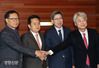 보폭 넓히는 혁통위 중도·보수 통합을 추진 중인 혁신통합추진위원회 박형준 위원장(왼쪽에서 세번째)이 29일 서울 여의도의 한 식당에서 한때 안철수 전 국민의당 대표계로 분류됐던 문병호 전 바른미래당 최고위원(첫번째), 김영환 전 국민의당 의원(두번째) 등과 만나 악수하고 있다. 김영민 기자 viola@kyunghyang.com |