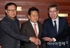 박형준 혁통위원장이 29일 서울 여의도의 한 호텔에서 안철수계로 분류되는 문병호 전 의원, 김영환 전 의원과 회동을 갖기에 앞서 손을 맞잡고 있다./윤동주 기자 doso7@ |