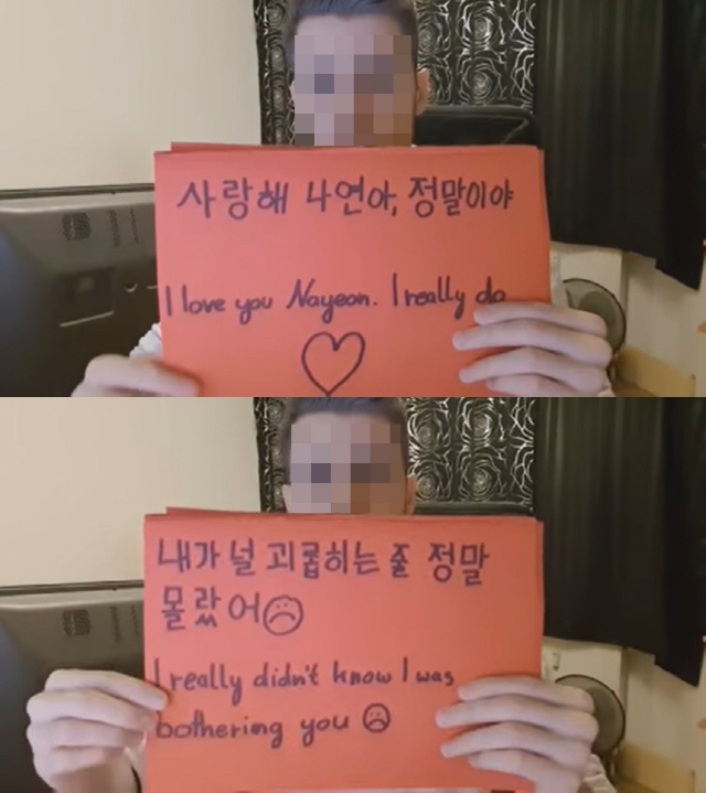 공개된 영상 속 A씨는 빨간색 종이에 한국어와 영어로 나연을 향한 사과의 메시지를 적어 카메라를 향해 들어 보였다. A씨는 “안녕. 나연아. 나 지금 독일로 돌아왔어. 내가 널 괴롭혔다면 진짜 미안해”라고 말했다.