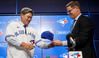 류현진이 입단 기자회견에서 모자를 받고 있다. 출처=스포츠넷 캐나다 |