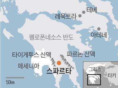 스파르타는 한때 아테네와 더불어 그리스 세계를 대표하는 폴리스였지만 오늘날은 인구 2만 명도 안 되는 작은 지방도시에 불과하다. 중앙광장을 장식하고 있는 ‘스파르타의 영웅’이란 제목의 동상은 용맹한 스파르타 전사와는 어울리지 않게 왜소하고 거대한 방패를 들 힘조차 없어 무릎을 꿇고 있다. 옛 동상의 오른손에는 장난감처럼 생긴 칼이 들려 있었으나 그마저도 어디론가 사라져버렸다. 힘에만 의존하다 그 힘을 잃었을 때 사람들의 기억 속에서 지워진 스파르타의 역사를 상징하는 듯하다. |