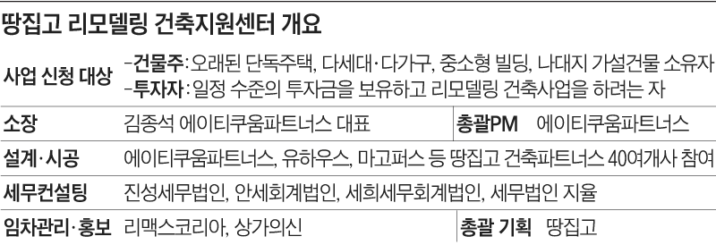 땅집고건축 사이트(www.zipgobuild.com)나 전화(02-724-6386)로 사업 신청을 하면 총괄PM회사인 에이티쿠움파트너스 전문가와 개별 상담, 현장 방문을 거쳐 가장 수익성 높은 리모델링 방안을 결정한다. 이후 PM 계약을 체결하고 건축주와 협의해 설계와 시공을 진행한다. 완공까지 4~5개월이면 끝난다. 리모델링 자금 조달 등 금융 서비스, 상속·증여 등 세무 자문 서비스도 함께 제공한다. 리모델링이 끝난 건물에 대해서는 땅집고가 보유한 다양한 온·오프라인 채널과 파트너사를 통해 건물 홍보와 임대차 마케팅을 지원한다. 김 소장은 "땅집고 리모델링 건축지원센터에선 무조건 허물고 부수는 개발 시대의 건축 방식에서 벗어나 지역 주민과 공동체의 생태계를 유지하면서 건축주도 수익을 올릴 수 있는 '공생의 건축사업 모델'을 제시할 것"이라고 했다.