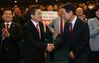 5일 오후 여의도 국회도서관에서 열린 미래한국당 중앙당 창당대회에서 당대표직을 맡게될 한선교 의원이 자유한국당 황교안 대표와 악수하고 있다./연합뉴스 |