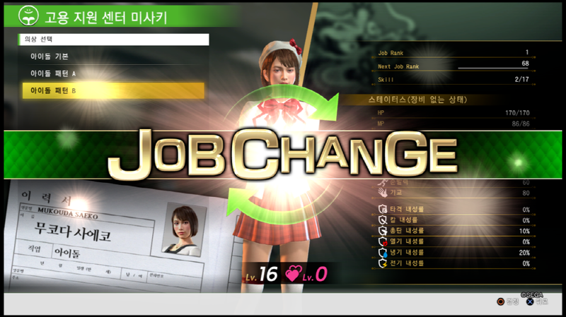 각 캐릭터는 전용 직업 이외에 주인공 카스가 이치반의 유대 관계 혹은 레벨에 따라 다양한 직업을 선택할 수 있으며, 철거업자, 보디가드, 댄서, 딜러는 물론 심지어 호스트와 나이트퀸에 이르는 해괴 망측한 직업도 선택할 수 있다.
