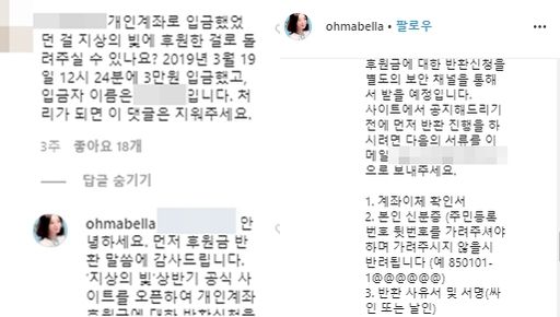 이에 윤씨는 댓글로 “후원금 반환은 상반기 ‘지상의 빛’ 공식사이트를 오픈해 개인계좌 후원금에 대한 반환신청을 별도의 보안 채널로 할 예정”이라면서도 “사이트에 공지하기 전 먼저 반환을 진행하려면 계좌 이체 확인서, 본인 신분증, 반환 사유서 및 서명 등을 포함해 특정 메일로 보내달라”고 답했다.