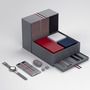 갤럭시 Z 플립 톰브라운 에디션은 톰브라운 신발 상자를 연상시키는 서랍장 타입의 패키지에 담겨 있으며 갤럭시 워치 액티브2, 갤럭시 버즈+가 함께 제공된다.