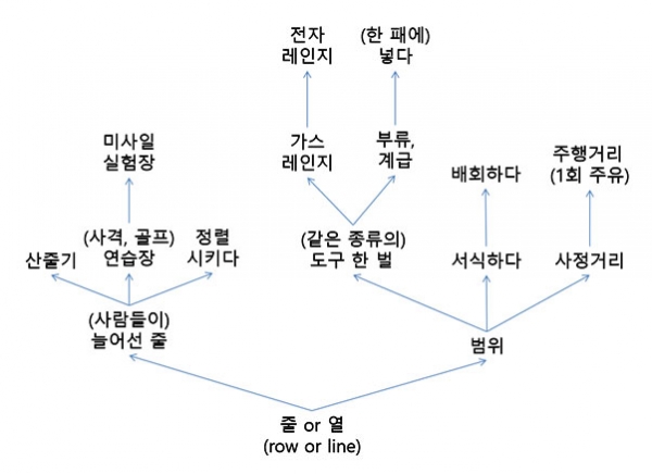 (사람들이) 늘어선 줄이라는 의미는 산이 줄지어 늘어서 있다는 의미의 ‘산맥’, 사람들이 한 줄로 서서 골프 연습을 하는 ‘골프연습장’, 또는 ‘어떤 물건 등을 줄을 맞춰 배치한다’는 의미로 확장된다. 한편, 줄의 길이를 의미하는 ‘범위’라는 뜻은 비슷한 것들을 모아 놓은 한 벌이라는 의미, 동물들이 서식하는 제한된 지역, 그리고 총기 등을 발사했을 때 탄환이 날아가는 거리 등으로 의미가 발전된다. ‘한 벌’은 둥근 모양의 스토브들을 한데 모아 놓은 가스레인지라는 의미와 비슷한 것들을 모아 놓은 부류나 비슷한 계층이 모인 계급이라는 의미로 확장된다. ‘배회하다’는 특정 지역을 돌아다니며 먹이 활동을 한다는 의미의 서식 행위에서 발전한 것으로 볼 수 있다.