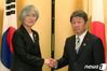 G20 외교장관회의 참석차 일본 나고야를 방문한 강경화 외교부 장관이 23일 모테기 도시미쓰(茂木 敏充) 일본 외무상과 한일 외교장관회담 전 악수하고 있다.(외교부 제공) 2019.11.23/뉴스1 |