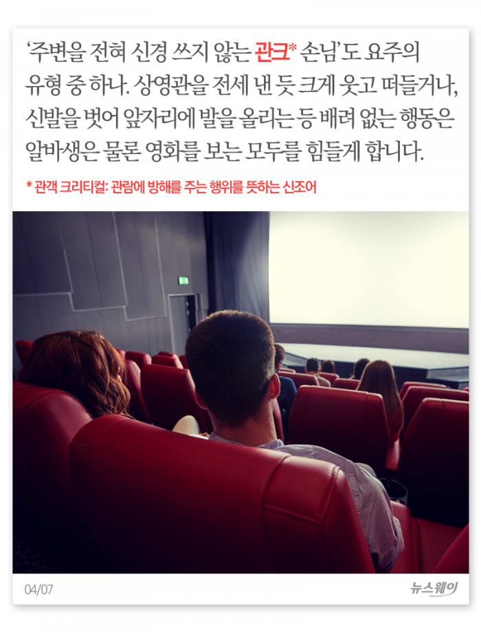 ‘주변을 전혀 신경 쓰지 않는 관크(관객 크리티컬: 관람에 방해를 주는 행위를 뜻하는 신조어) 손님’도 요주의 유형 중 하나. 상영관을 전세 낸 듯 크게 웃고 떠들거나, 신발을 벗어 앞자리에 발을 올리는 등 배려 없는 행동은 알바생은 물론 영화를 보는 모두를 힘들게 합니다.