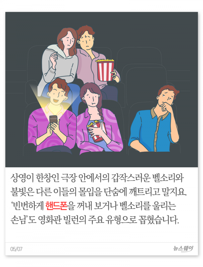 상영이 한창인 극장 안에서의 갑작스러운 벨소리와 불빛은 다른 이들의 몰입을 단숨에 깨트리고 말지요. ‘빈번하게 핸드폰을 꺼내 보거나 벨소리를 울리는 손님’도 영화관 빌런의 주요 유형으로 꼽혔습니다.