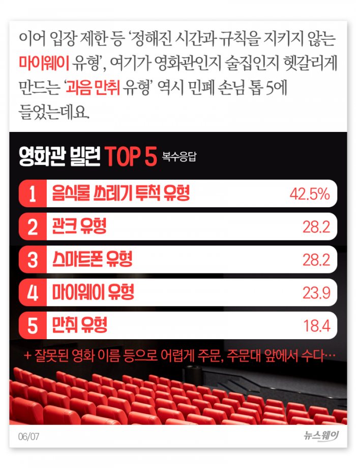 이어 입장 제한 등 ‘정해진 시간과 규칙을 지키지 않는 마이웨이 유형’, 여기가 영화관인지 술집인지 헷갈리게 만드는 ‘과음 만취 유형’ 역시 민폐 손님 톱 5에 들었는데요.
