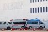 (요코하마 로이터=연합뉴스) 6일 일본 도쿄 남쪽 요코하마 항 다이코쿠 부두에 접안한 대형 크루즈선 '다이아몬드 프린세스'호 인근에서 구급차 한 대가 크루즈선의 신종 코로나바이러스 감염증 확진자들을 병원으로 이송하기 위해 대기하고 있다. |