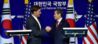 정경두(오른쪽) 국방부 장관과 마크 에스퍼 미 국방부 장관이 작년 11월 15일 서울 용산구 국방부에서 열린 제51차 한·미 안보협의회(SCM) 고위회담에서 공동 기자회견을 마친 뒤 손을 맞잡고 있다. /사진공동취재단·연합뉴스 |