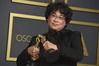 봉준호 감독이 9일(현지시간) 미 캘리포니아주 로스앤젤레스의 돌비 극장에서 열린 제92회 아카데미 시상식에서 영화 '기생충'으로 받은 감독상, 국제영화상을 들고 기자실에서 포즈를 취하고 있다. 로스앤젤레스=AP 뉴시스 |