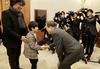 문재인 대통령이 20일 청와대에서 영화 ‘기생충’ 제작진, 배우 초청 오찬에 앞서 아역배우 정현준과 인사하고 있다. 맨 왼쪽은 봉준호 감독.(사진=연합뉴스) |