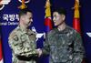 합참 공보실장 김준락 대령(오른쪽)이 27일 오전 서울 용산구 국방부에서 코로나19로 인한 한미연합군사훈련 연기에 대한 브리핑을 마치고 한미연합사 공보실장 피터스 대령과 악수 하고 있다(사진=사진공동취재단). |