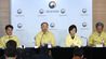 27일 서울 종로구 정부서울청사에서 열린 '마스크 수급 안정 긴급 합동브리핑'에서 홍남기 경제부총리 겸 기획재정부 장관이 발표문을 읽고 있다. 왼쪽부터 박종석 우정사업본부장, 홍 부총리, 이의경 식약처장, 김병수 농협하나로마트 회장. (연합뉴스) |