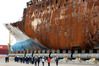 단원고등학교 학생 희생자 유가족이 녹슨 세월호 선체를 살펴보고 있다. 연합뉴스 |