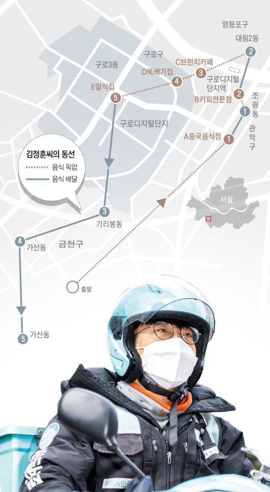 토요일인 지난 22일, 서울 서남부 지역에서 일하는 ‘배달의 민족’ 배달원 김정훈(39)씨의 스마트폰에 음식점 130곳 이름과 배달지 주소가 떴다. 김씨는 스마트폰 스크롤을 올리고 내리면서 머릿속에 음식점 동선을 그렸다. 약 10분 만에 5곳을 정하고 자신이 배달하겠다며 ‘배달 요청’ 버튼을 누른 뒤, 오토바이 시동을 걸었다.