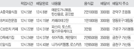 김씨는 3분 만에 첫 음식점을 골랐다. 관악구 조원동에 있는 중국 음식점A. 주문 메뉴는 매운 도가니 볶음 하나와 탄산음료 1개, 공깃밥 한 그릇이다. 김씨 집에서 약 1.7㎞ 떨어진 곳인데, 3분 정도면 닿을 수 있다고 했다. 배달지는 A에서 직선거리로 200m 떨어진 아파트다. 김씨는 "오 예, 꿀콜이다"라며 '배차 요청(선택)' 버튼을 눌렀다. 꿀콜은 좋은 배달을 뜻하는 속어다.