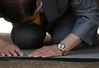 이만희 신천지 총회장이 2일 오후 경기 가평 평화연수원에서 기자회견을 하며 왼쪽 손목에 봉항 무늬와 박근혜 전 대통령 이름이 새겨진 시계를 찬 채 큰절을 하고 있다. 가평=뉴시스 |