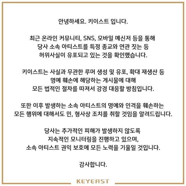 키이스트 측은 "최근 온라인 커뮤니티, SNS, 모바일 메신저 등을 통해 당사 소속 아티스트를 특정 종교와 연관 짓는 등 허위사실이 유포되고 있는 것을 확인했다"라면서 "사실과 무관한 루머 생성 및 유포, 확대 재생산 등 명예 훼손에 해당하는 게시물에 대해 모든 법적인 절차를 따져서 강경 대응할 방침이다. 이후 발생하는 소속 아티스트의 명예와 인격을 훼손하는 모든 행위에 대해서도 민, 형사상 조치를 취할 것임을 알려드린다"라고 말했다.