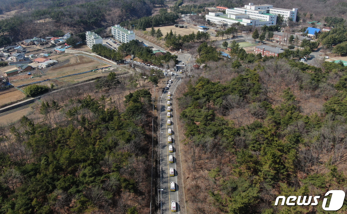 (대구=뉴스1) 공정식 기자 = 5일 오후 신종 코로나바이러스 감염증(코로나19) 확진자 이송 임무를 맡은 119구급차가 확진자를 태우고 경북 경산시 하양읍 국군대구병원으로 들어가기 위해 줄지어 차례를 기다리고 있다.