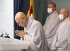 대한불교조계종 감염병 비상대응본부장인 총무부장 금곡 스님이 6일 서울 종로구 견지동 한국불교역사문화기념관에서 총무원장 원행 스님 대신 신종 코로나바이러스 감염증(코로나19) 관련 담화문을 발표한 뒤 합장하고 있다. 뉴시스 |