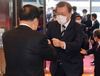 여야 정당 대표들을 만나기 위해 국회를 방문한 문재인 대통령이 28일 오후 영접 나온 문희상 국회의장과 악수 대신 주먹을 맞대며 인사하고 있다. |