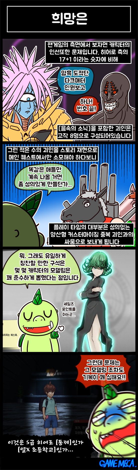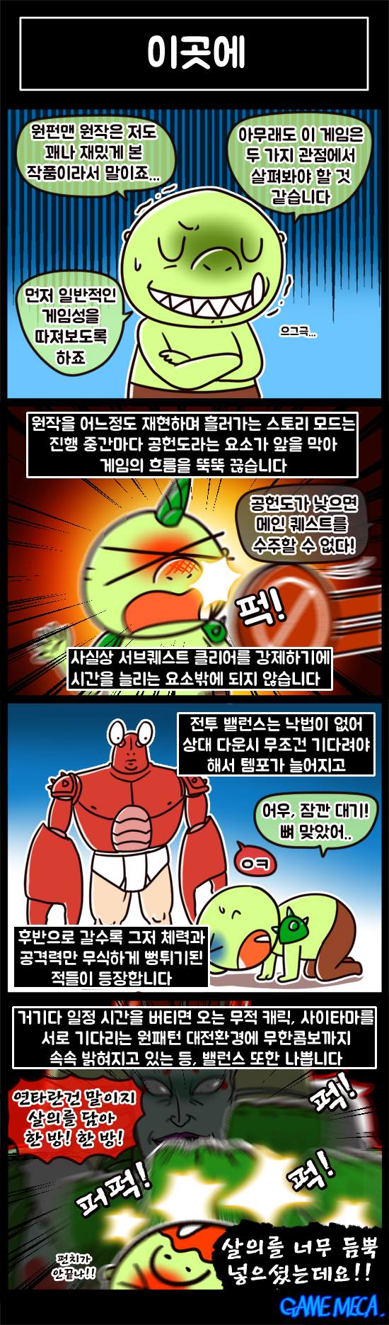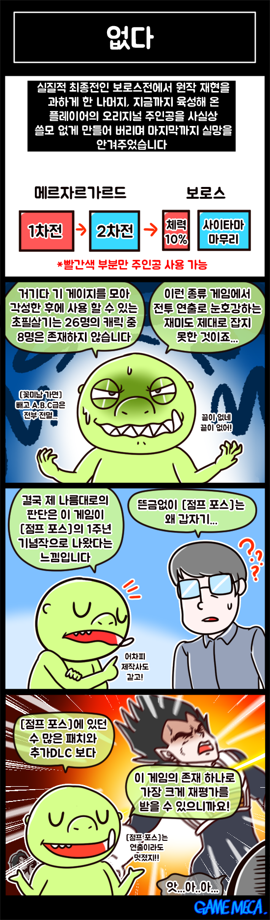 게임 속에서 고통받기 전문가, 네이버 게임툰 [하루4컷]으로 유명한 노동8호가 게임메카 리뷰툰으로 돌아왔습니다. 이번 주에는 인기 만화 원펀맨을 원작으로 한 격투 게임 '원펀맨 어 히어로 노바디 노우즈'인데요, 노동8호는 예전에 본인에게 고통을 줬던 점프포스가 떠올랐다고 합니다. 이번 주 [노8리뷰]를 만나 보시죠.