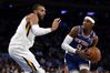 루디 고베어(왼쪽)가 지난 5일 미국 뉴욕에서 열린 유타 재즈와 뉴욕 닉스의 경기에서 상대 가드 RJ 바렛을 수비하고 있다. AP 연합뉴스 |