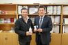 김태형 ㈜미꾸밈 대표(왼쪽)가 최규환 동아대 학생·취업지원처장에게 손세정제를 전달하면서 기념촬영을 하고 있다. 동아대학교 제공 |
