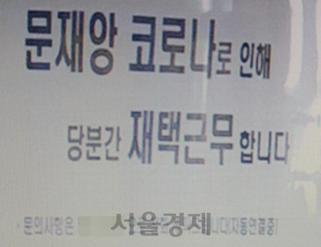 13일 인터넷 커뮤니티 등에 올라온 사진에는 하나투어 소속 판매점 유리창에 ‘‘문재앙’ 코로나로 인해 당분간 재택근무 합니다’라는 안내문이 붙어 있다. 안내문 아래에는 ‘하나투어 역삼이마트점 올림’이라는 문구도 적혀 있다.
