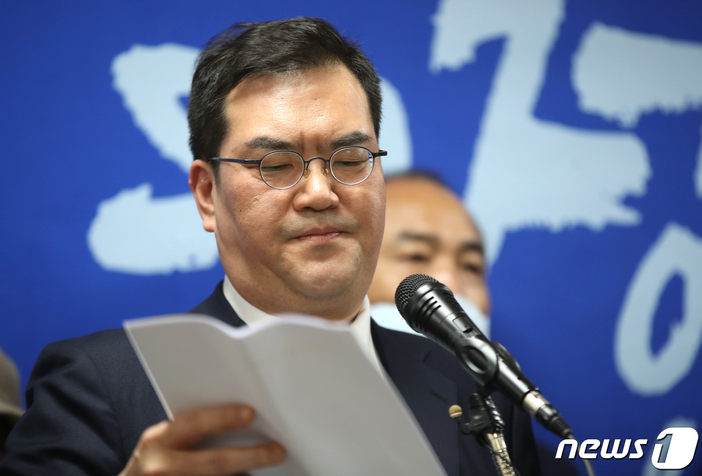 (의정부=뉴스1) 이광호 기자 = 문희상 국회의장의 아들 문석균 씨가 17일 오후 경기도 의정부시청에서 기자회견을 열고 4.15총선 경기 의정부갑 무소속 출마를 선언하고 있다. 문 씨는 더불어민주당 예비후보로 등록하고 아버지 문 의장이 6선 의원을 지낸 경기 의정부갑 지역구 출마를 준비했으나, 지역구 세습 논란이 일자 출마를 포기했었다.2020.3.17/뉴스1