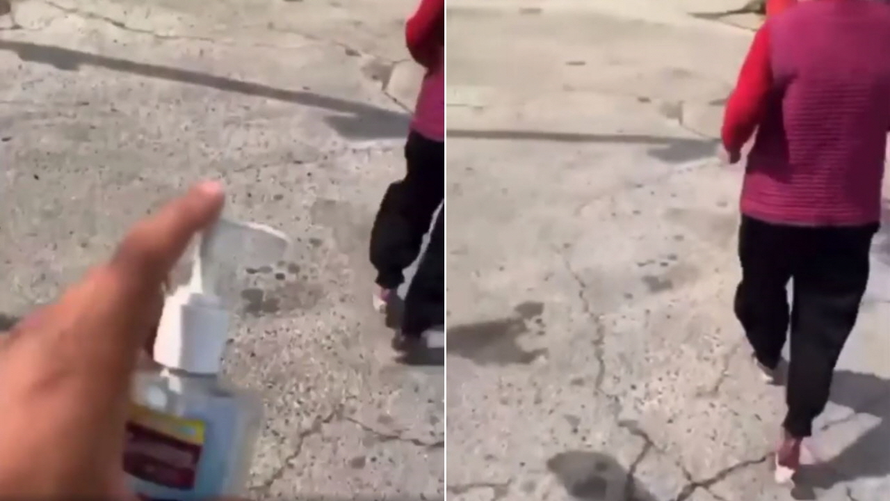 한 외국인이 한국인 할머니를 쫓아다니며 손 소독제를 뿌리는 영상이 누리꾼들의 공분을 일으키고 있습니다.